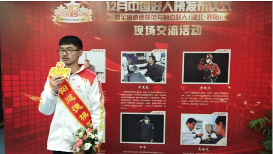 2019年12月27日晚中國好人榜發布儀式暨全國道德楷模與身邊好人現場交流活動在襄陽體育館舉行,我校高二學子王子豪同學作為“襄陽道德模范”應邀參加交流活動,在活動現場王子豪同學與全國道德模范和中國好人分享了自己的事跡,感動了在場的很多觀眾,活動中全國道德模范代表為子豪同學頒發 “道德傳家寶”印章一枚,對子豪同學的孝老愛親行為予以肯定,也將激勵子豪同學將這種美德永不停歇的接力下去。